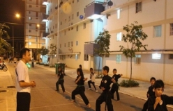 Hằng đêm dưới sân sinh hoạt ở khu căn hộ xã hội con em cư dân ở đây được dạy võ