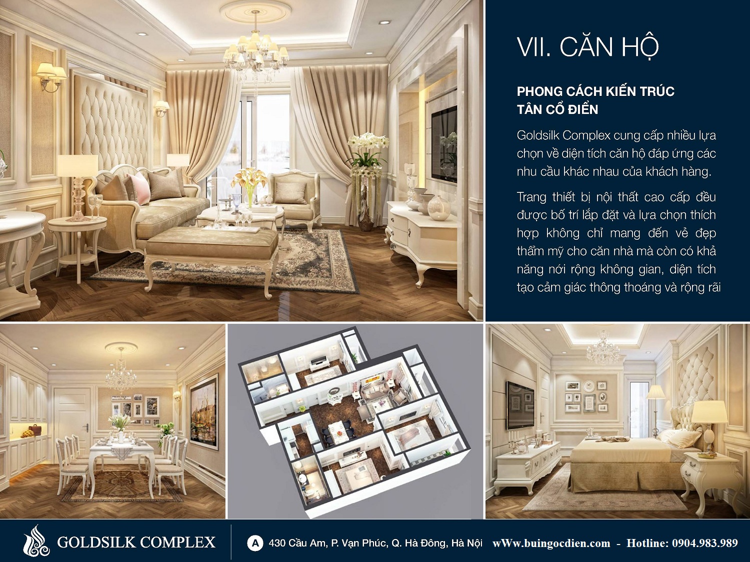 - Các căn hộ được thiết kế hiện đại, được tối ưu hóa các công năng sử dụng kết hợp với nhiều tiện ích vượt trội, goldsilk complex sẽ đem đến không gian thư giãn cho cư dân sống tại đây. - Goldsilk complex một không gian sống đẳng cấp Châu Âu giữa trung tâm hành chính lớn Q. Hà Đông thủ đô Hà Nội.